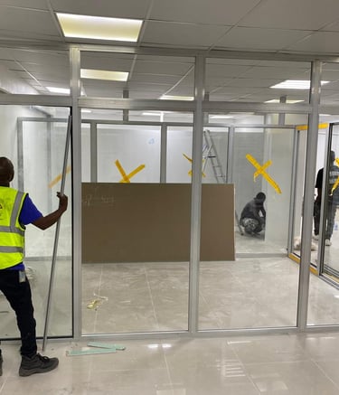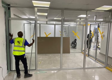 Fourniture et pose des cloisons en aluminium avec double vitrage, cloisons et panneaux décoratifs en gyproc/Bureaux MATIC/2024